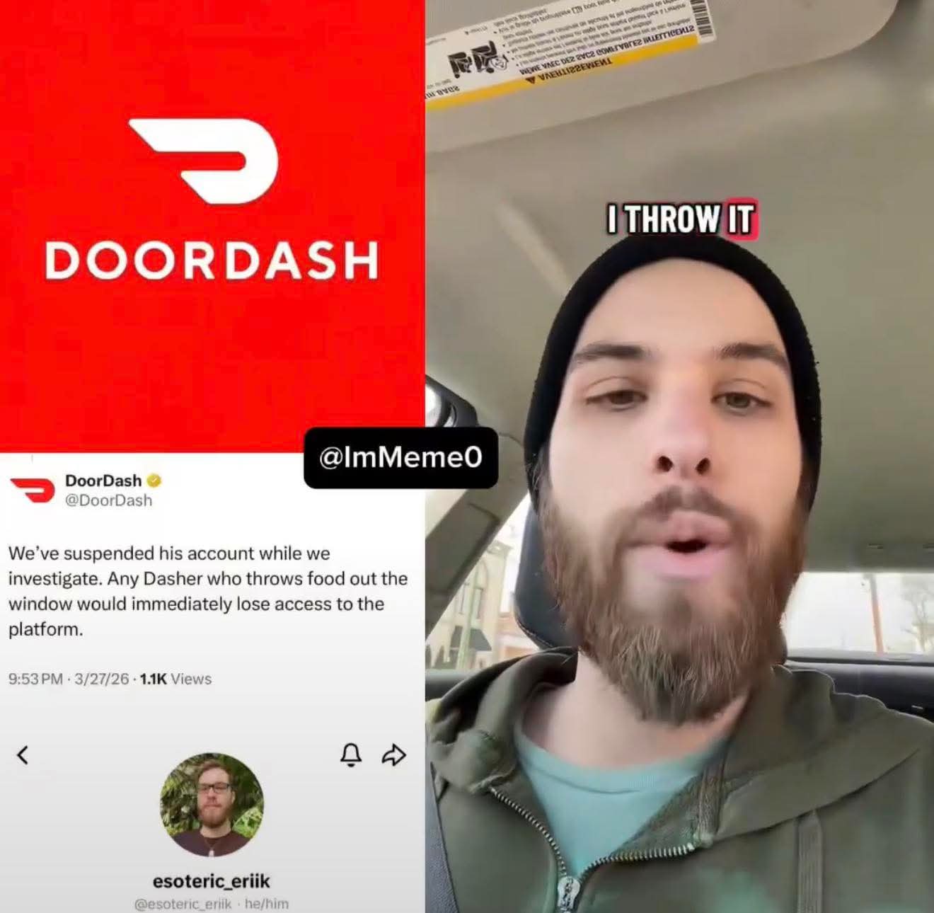 DoorDash Fires MAGA-Hating Driver Who Vowed to Trash Trump Supporters' OrdersA TikTok clown calling himself "Esoteric Erik" just learned the hard way that conservatives pay for food, not leftist lectures. The DoorDash driver proudly declared he'd chuck customers' meals out the window if he spotted a MAGA sign in their yard.No surprise from the tolerant left: hate Trump voters, punish them at dinner time. But DoorDash didn't play along with the deranged stunt. They suspended his account fast, stating any dasher caught throwing food "would immediately lose access to the platform."The company focused on the waste, but everyone sees the real rot— this guy couldn't separate his TDS meltdown from doing the job he was paid for. Plenty of replies nailed it: guys like this are the reason people worry about tampered food from strangers. If he'll brag about trashing orders over politics, what else is he capable of?DoorDash did the bare minimum by booting him during the investigation. Good call, but the bigger lesson is clear: keep your personal grudges out of the delivery bag. Half the country supports Trump and keeps the economy moving—including tipping for hot food on time.Erik can rage on TikTok all he wants now. Just don't expect another paycheck from actual working Americans. Actions have consequences, even for entitled gig workers.HT IMMEME0