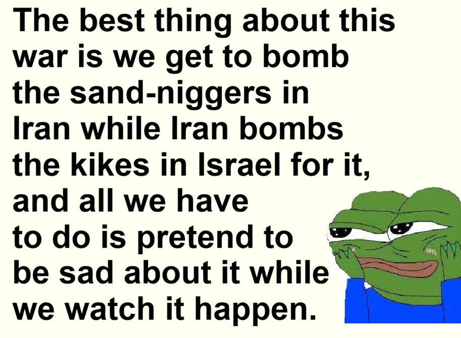 >be supreme sandnigger>tell your sandnigger country to prepare for war for decades>DECADES>war happens>well, you dont know it happens because you die in the first strike>most of your family dies in the first strike>most of your general staff dies in the first strike>your first replacement dies in the second strike>most of his general staff dies in the second strike>your second replacement dies in the third strike>most of his general staff dies in the third strike>majority of senior officials from 2 months ago now just various scattered piles of burnt meat covered in sand>entire navy upgraded to artificial coral reefs>air "force" obliterated and so scared shitless the last functional Tomcats get destroyed on the ground instead of the flaming air to air death against the F22 they deserved>the replacements-of-the-replacements-of-the-replacements running things now start posting ARMA footage like it actually happened and posting the most obvious boomer tier AI imaginable>only guys left to run the country are nepo baby lower management with no experience and no clue>theyre a global laughing stock>your idiotic sandmonkeys have the galaxy brain idea to make a cardboard cutout of your dead son the new Supreme Replacement>cant bomb a guy thats already dead right?>the Ghost of Hugo Chavez is still crying over the crater that was his mausoleum thoug>oh fuck, they bombed the fuckin cardboard>purely for the love of the game>BUT ALL IS NOT LOST>a discord tranny and some 400lb blue haired genderxir on the internet have turned you into their new GrEaT bRoWn HoPe and they SWEAR you are winning the war because your retarded sandmonkeys MIGHT have managed to accidentally shoot down a flying Buc-ee's and occasionally can throw an exploding rock at people>the same people who spent years screaming slava Ukrani and that insisted Venezuela would win too>they arent known for picking winners>but it doesn't matter to you>because youre just a pile of burnt meat