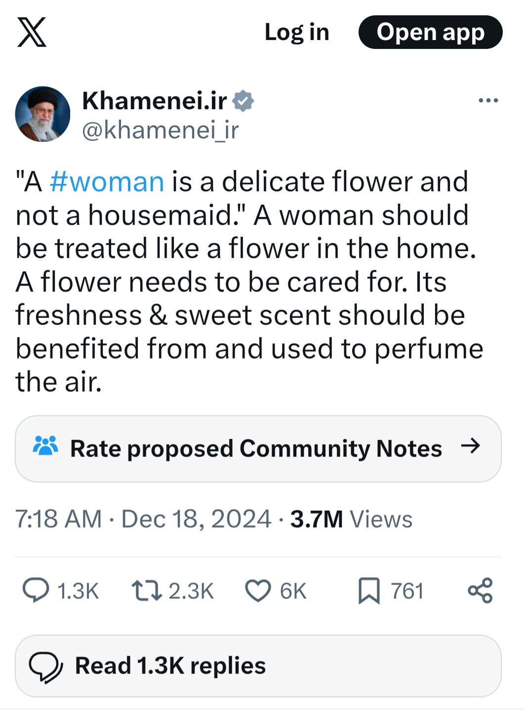 Iranian women should have sex with no less than 50 men before they even consider raising a family and then have 1 child when they are 42. That is equality.