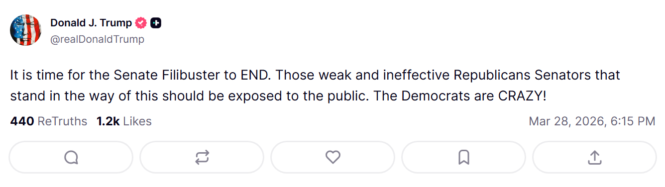 I don't think Trump is a big fan of the filibuster...or certain Senate "Republicans". https://truthsocial.com/@realDonaldTrump/posts/116309106577650785