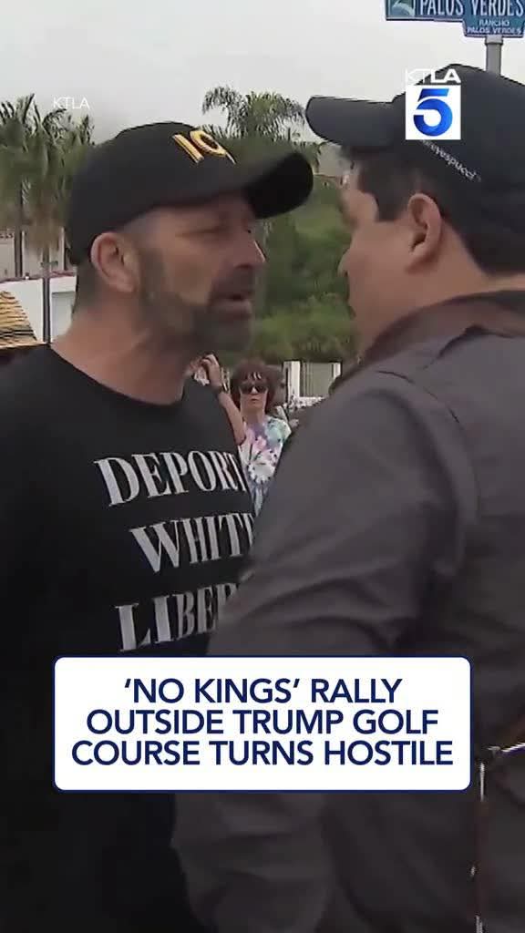 Leftist Mob Melts Down Over 'Deport White Liberals' Shirt at Anti-Trump ProtestRancho Palos Verdes, California — March 28, 2026. So much for tolerant liberals. A pack of "No Kings" protesters swarmed a lone conservative man wearing a "Deport White Liberals" t-shirt outside Trump National Golf Club, screaming insults and demanding he leave because one guy with a different opinion somehow terrified them.The video shows the man standing his ground calmly as dozens circle him, megaphones blaring and the crowd chanting nonstop. "Racist! Racist! Racist!" a woman shouts through the megaphone. "Go home! Go home!"Protesters pile on with raw fury. "You're a fucking racist!" one yells. "Racists go home! Racists go home!" the group chants in unison, whistles and noise filling the air. When the man quietly responds, "I'm not a racist," they drown him out instantly: "Yes you are!" "Get the fuck out!" "Leave! Racist!"The harassment continues for the full 40 seconds captured: "Racists go home!" repeated like a broken record, with extra jabs like "You're scaring people!" thrown in. Police stand nearby watching but don't step in as the mob presses close, all because one man dared show up with a shirt mocking their own hypocrisy.This is the "resistance" in action — peaceful on paper, but a snarling intolerance fest up close. One guy outnumbered 50-to-1 triggers their full meltdown, proving once again that leftists love diversity of everything except thought. Free speech only applies when you agree with them. The rest get labeled, shouted down, and chased off.Classic projection from the tolerant crowd.