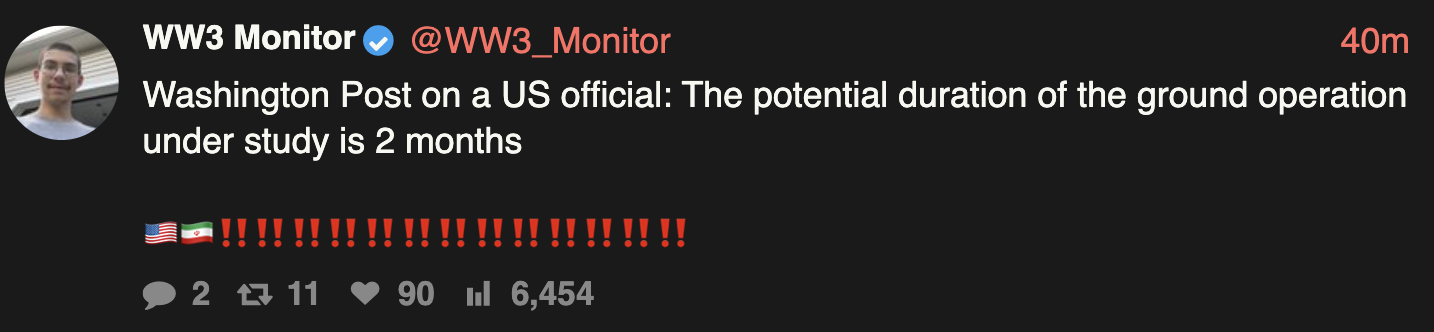 BOOTS ON THE GROUND CONFIRMED HAPPENING>BOOTS ON THE GROUND CONFIRMED HAPPENINGBOOTS ON THE GROUND CONFIRMED HAPPENINGThe Pentagon is preparing plans for weeks of ground operations in Iran – potentially including raids on Kharg Island and coastal sites near the strait of Hormuz – though President Donald Trump has not yet approved any deployment, the Washington Post is reporting.Any ground operation would stop short of a full-scale invasion, instead involving raids by special operations forces and conventional infantry troops, the Post said, citing unnamed officials.