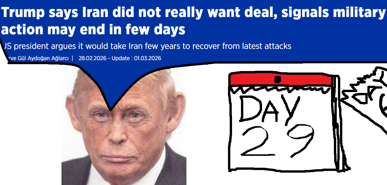 >>531857661>>531857712probably 5 years at the most. they won't conquer iran, they have way too few troops to do so, and even if they had enough, there was no preparation done and the US is broke and out of all kinds of weapons. There needed to be years of rebuilding arsenals/manufacturing due to losses in ukraine + ~6 months of staging and prep before the invasion. Israel forced trump's hand and they're totally unprepared for a lengthy or large ground invasion.