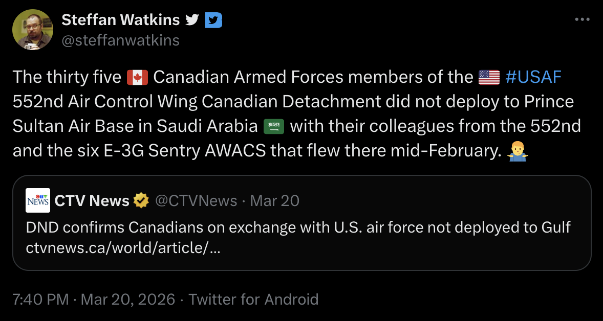 >>531863516I bet there's still an AWACS or 3 in western Saudi Arabia at that mega base.That base is overloaded right now, including most planes and personnel from that Riyadh air base that keeps getting bombed.Then there's the one in Djibouti that seems to be getting loaded up right now with US planes for this ground invasion of iran.