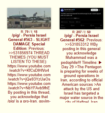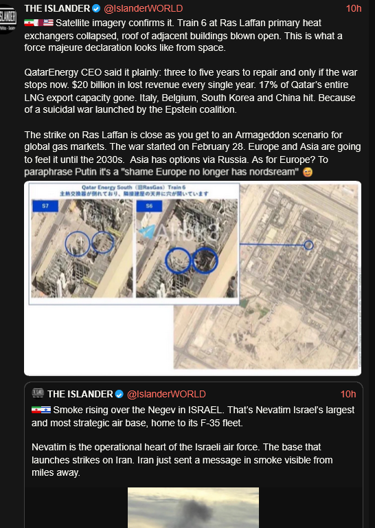 Previous: >>531856974THREAD THEMES (YOU MUST LISTEN TO THESE):https://www.youtube.com/watch?v=KfCsDlHlVo4https://www.youtube.com/watch?v=jQe93YzUaOshttps://www.youtube.com/watch?v=NbYFAvb9fhEBy posting in this thread, you acknowledge that /pig/ is a pro-Iran, goyim-owned thread, and you denounce the Talmud.Timeline:▶ Day 29>Photos have surfaced showing extensive damage to US Air Force E-3 Sentry AE11EA 81-0005 following the drone and missile attack at Prince Sultan Air Base yesterday that also damaged several KC-135s.>An attack by the US and Israel has targeted a major water source in the city of Haftgel, Iran promises retaliation>Trump extended his deadline for Iran to open the strait of Hormuz by another 10 days, to 6 April.>Iran says destroyed Ukrainian anti-drone depot in Dubai for assisting US military. 21 Ukrainian present>Houthis enter war. Missiles at "sensitive military targets" in "occupied Palestine" or Israel>The BAPCO refinery complex on fire in Riffa, Bahrain▶KinoNEW:https://files.catbox.moe/smmsfw.mp4https://files.catbox.moe/jv7tdp.mp4https://x.com/RoaaWarStudies/status/2037578330954719508▶Livestreamshttps://www.youtube.com/watch?v=4E-iFtUM2kk https://www.youtube.com/watch?v=TdcrT5OcS9c https://www.youtube.com/watch?v=53G-Oy4r6M4 ▶Telegram channelshttps://rentry.org/tgnews▶Israel Rocket Alertshttps://www.tzevaadom.co.il/en/▶Air Traffichttps://www.flightradar24.com/https://flightaware.com/livehttps://globe.adsbexchange.com▶Maritime Traffichttps://www.marinetraffic.com/https://www.vesselfinder.com/