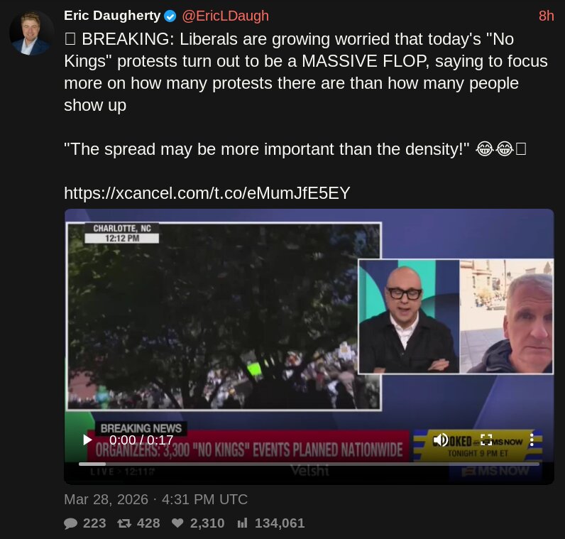 >>531862458I went to my local one. Last time there was somehwere between 100-150 people. Today no one showed up. I know I had the right place because there was a whole ass website for it and other lookyloos slowed down and rubbernecked looking for anyone to show up, but it was a bust.
