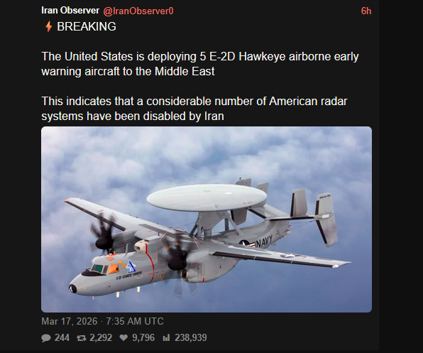 >>531867491>>531867120yeah these are the mini-awacs they keep on air craft carriers. shit range probably, and slow prop powered plane with huge radar signature.this is the kind of plane that they would need to place right back in the Riyadh air base where the big awacs was just bombed.