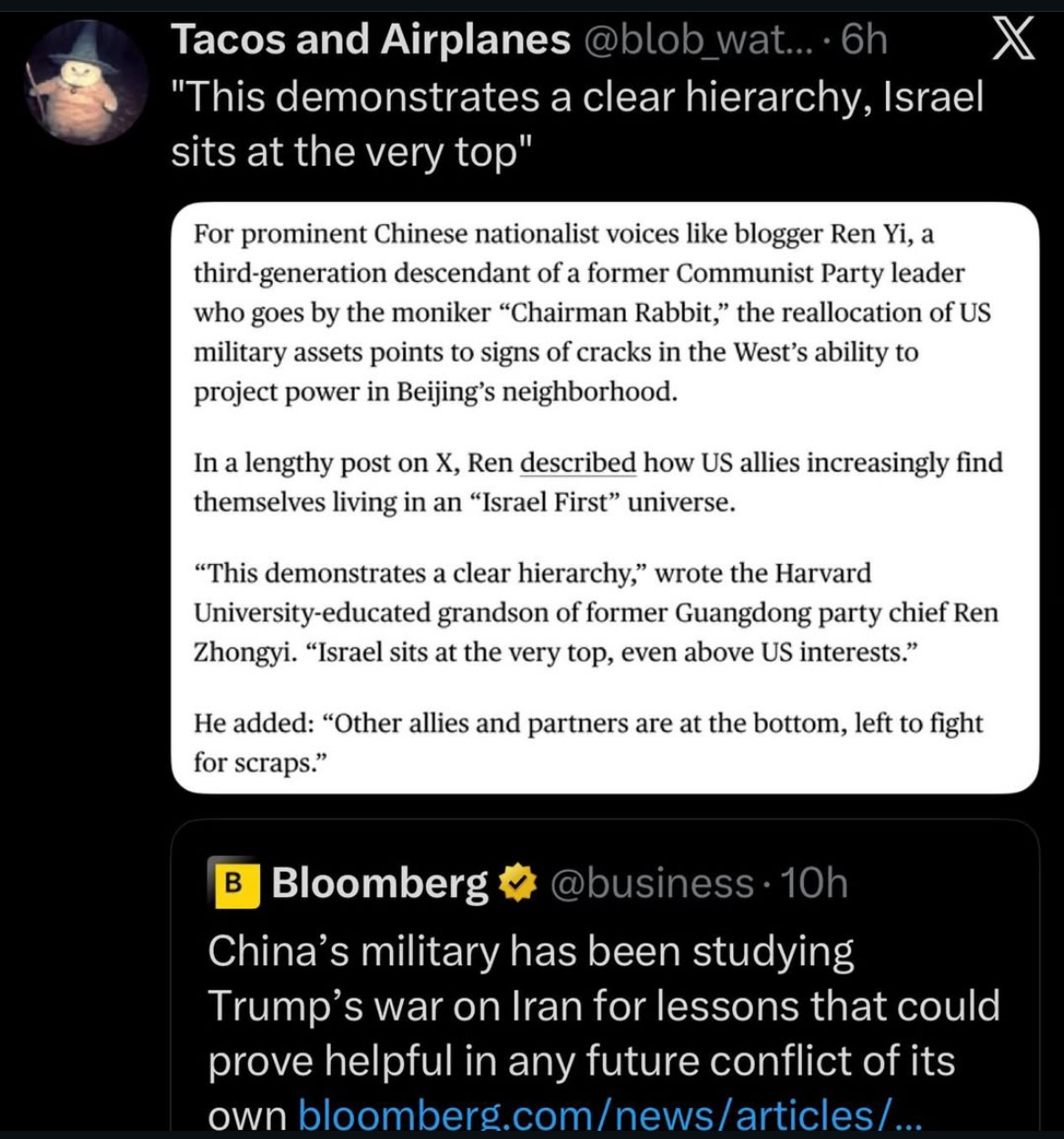 >>531870660>reallocation of us military assets means cracks in the west's ability to project power on SE asiait doesn't mean that though, in the slightest. our ability to project power in taiwan and japan has nothing to do with some tiny number of troops getting shuffled around. this claim is actually retarded. since this guy is harvard educated though (so fancy) i will give him the benefit of the doubt and presume he doesn't actually mean it but counts on retards lapping it up.the rest about israel has nothing to do with this juvenile claim about troop movements = US lost it's geopolitical stranglehold on the chinks. this is chink cope about how we are actively fucking their 2nd biggest oil provider in the ass. and beyond that, half of all their oil imports come from the gulf. if we get de-facto control over hormuz as a result of that's a massive hit to THEIR ability to project any power at all.so this is literally chink cope about how fucking them in the ass is actually them winning lmao.