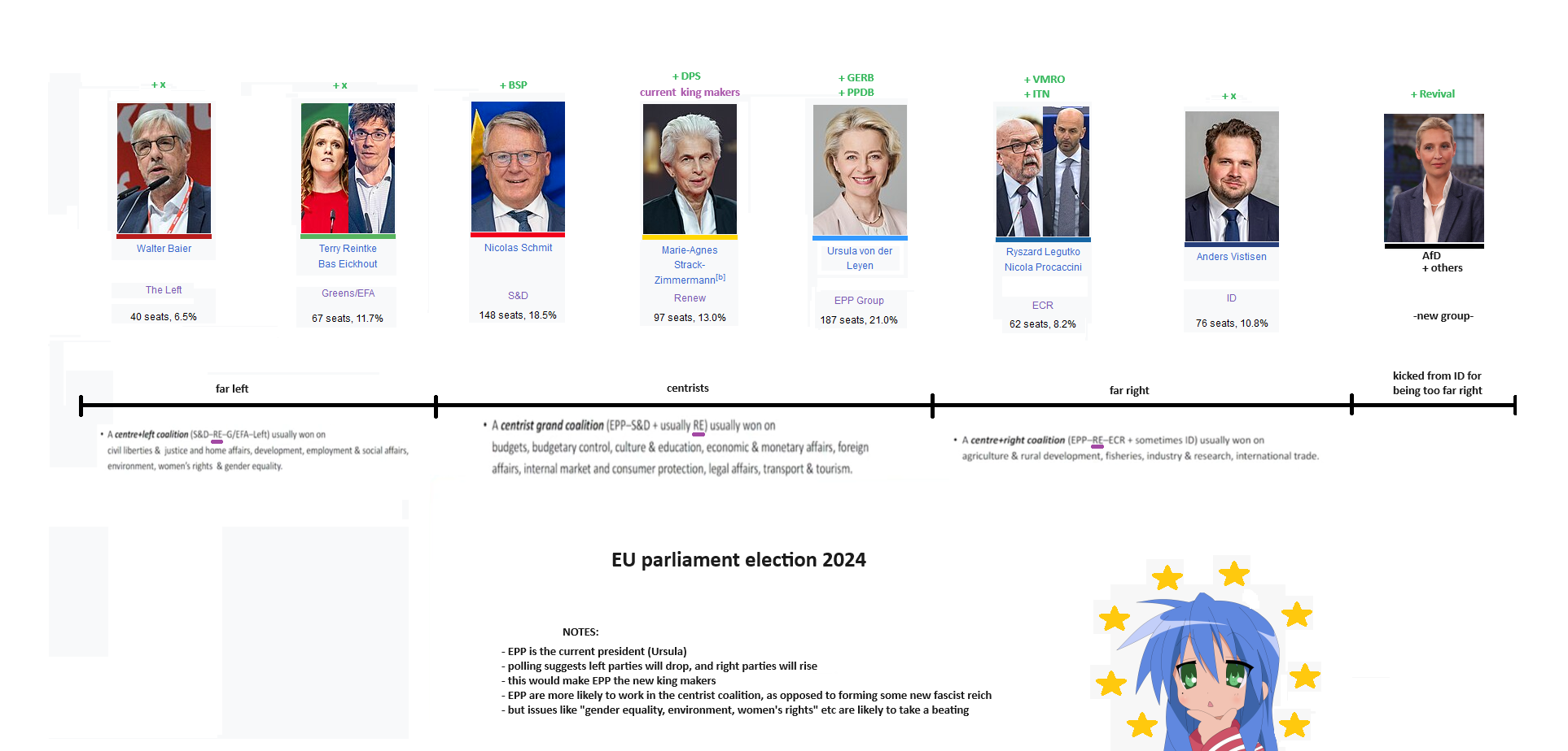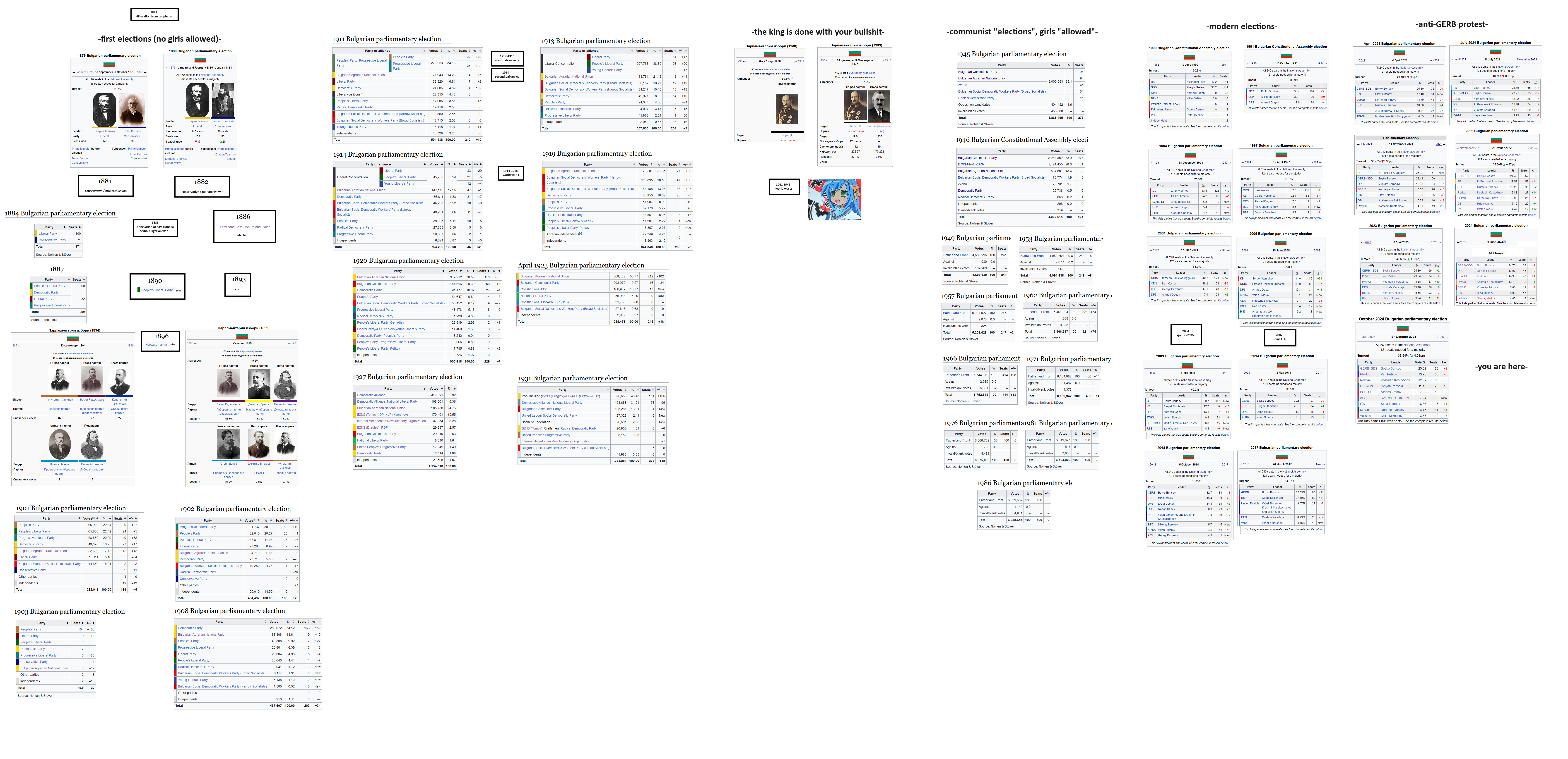 >>531882905>election 7, 2024. turnout 39%the current head of the turkish party (DPS) out-corrupts the old head of the turkish party (APS). former PPDB members leak proof of corruption, and form MECh. the heads of PPDB resign due to the corruption, and the head of BSP also resigns to appease their splinter groups.coalition is formed by GERB, BSP, ITN and DPS. and i stop paying attention to politics for a while, so who knows what else happens. =---=GERB- 25%, PPDB- 14%Revival- 13%, BSP- 7%, Greatness- 4%DPS- 11%, APS- 7%ITN- 7%, MECh- 5%=---=PPDB, Revival and other stage anti-corruption protests, this somehow forces the government to resign.the president also resigns, and throws his hat in the race, creating PB. polling suggests that PB is going to get over 30% of the vote. GERB 20%, PPDB 13%, DPS 7% and Revival 6%. nobody else is guaranteed to enter.this suggests that PD has sucked up the "pro-russia/neutral" votes. this makes sense, when you factor in that the former president was the BSP supported candidate during his election. however his party has only made pro-west and pro-right wing (economically) statements, so we won't know until he's in power.he might make a coalition with GERB / PPDB / DPS. he also might make a coalition with Revival / BSP (if the votes allow it). or he might not make a coalition with anyone, and we hold another election later this year, when the current presidential term ends. (2 in 1, around october)>election 8, 2026you are here