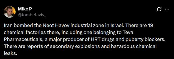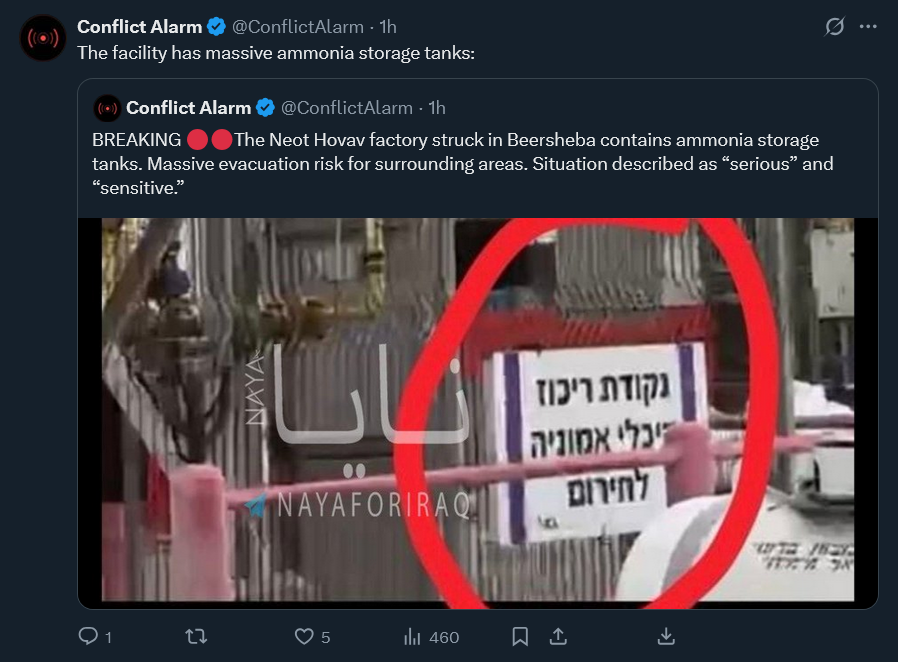 >>531893091> By March 11th according to Haaretz6,586 claims for damage to buildings.1,485 claims for damage to vehicles.1,044 claims for damage to equipment/contents.>Industrial sitesICL Rotem fertilizer phosphorus factoryBazan Oil Refinery in HaifaYehuda Steel Factory in AshdodOrot Rabin Power Plant HaderaRutenberg Power Station AshkelonHaifa Port impacted by shrapnelSatellite Reception/Communication Sites hitLeviathan and Tamar LNG rigs closedAnd now, Ramat Hovav chemical complex hit
