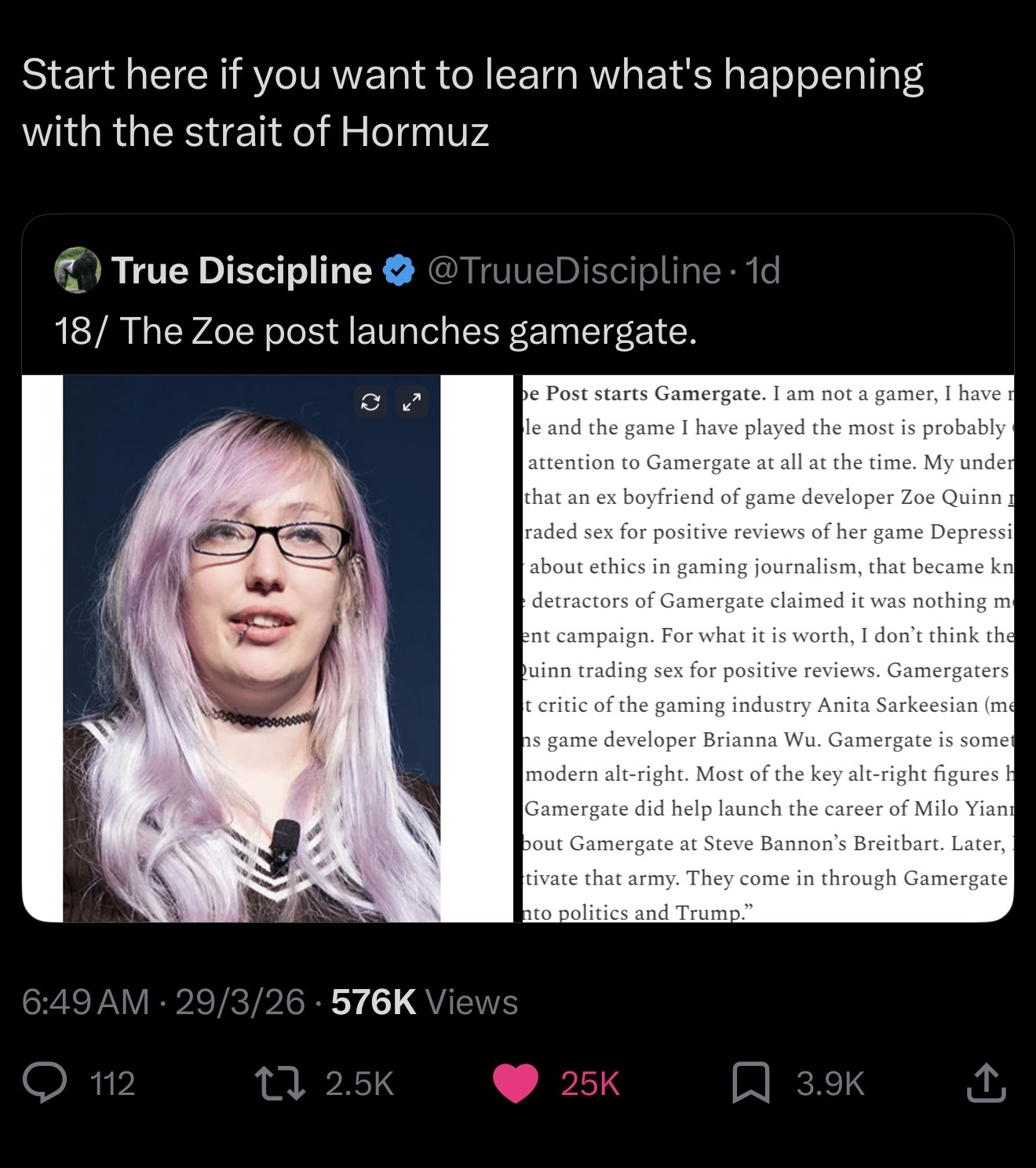 >>531906835If you thought gamergate had anything to do with zoe quinn or anita sarkesian you dont know anything and just accepted what was presented by news sites. You are a literal npc. Gamergate started from tortanic. Reviewers gave TOR insanely positive reviews and the game was a dumpsterfire on release. Reviewers just ignored consumers and the rift between consumer and reviewer widened so much it turned into anger and hatred. The targeted attacks on gamers were part of this because the reviewers were colluding together to protect the interest of the publishers. There were probably less than a couple thousand people actually harassing anita and zoe. But they were the ones that news sites tried to focus on because they were also protecting reviewers and corpo interests.