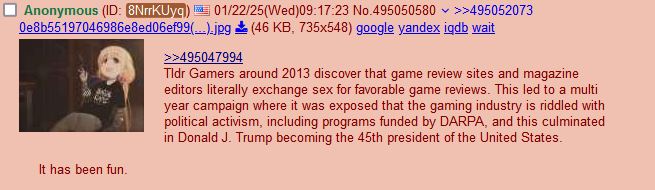 >>531901142Believe it or not, but before GamerGate it was a loony box conspiracy theory, that gaming media could be BRIBED or COERCED to hand out positive reviews or to enforce particular politics.>bro it's just games>like games, for kids>dude I mean like how it could work men in black knocking to the door or whatYou get the idea.Occasional incidents like the Dorito Pope in 2012 could be downplayed, but not the GG shit storm.