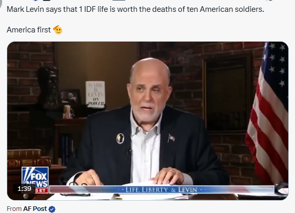 >>531917327and nobody was suprised. the guy Trump simped for today, Mark Levin, who is currently trying to hype the marines to go die over there literally said that 1 IDF life is worth 10 american soldiers lives.