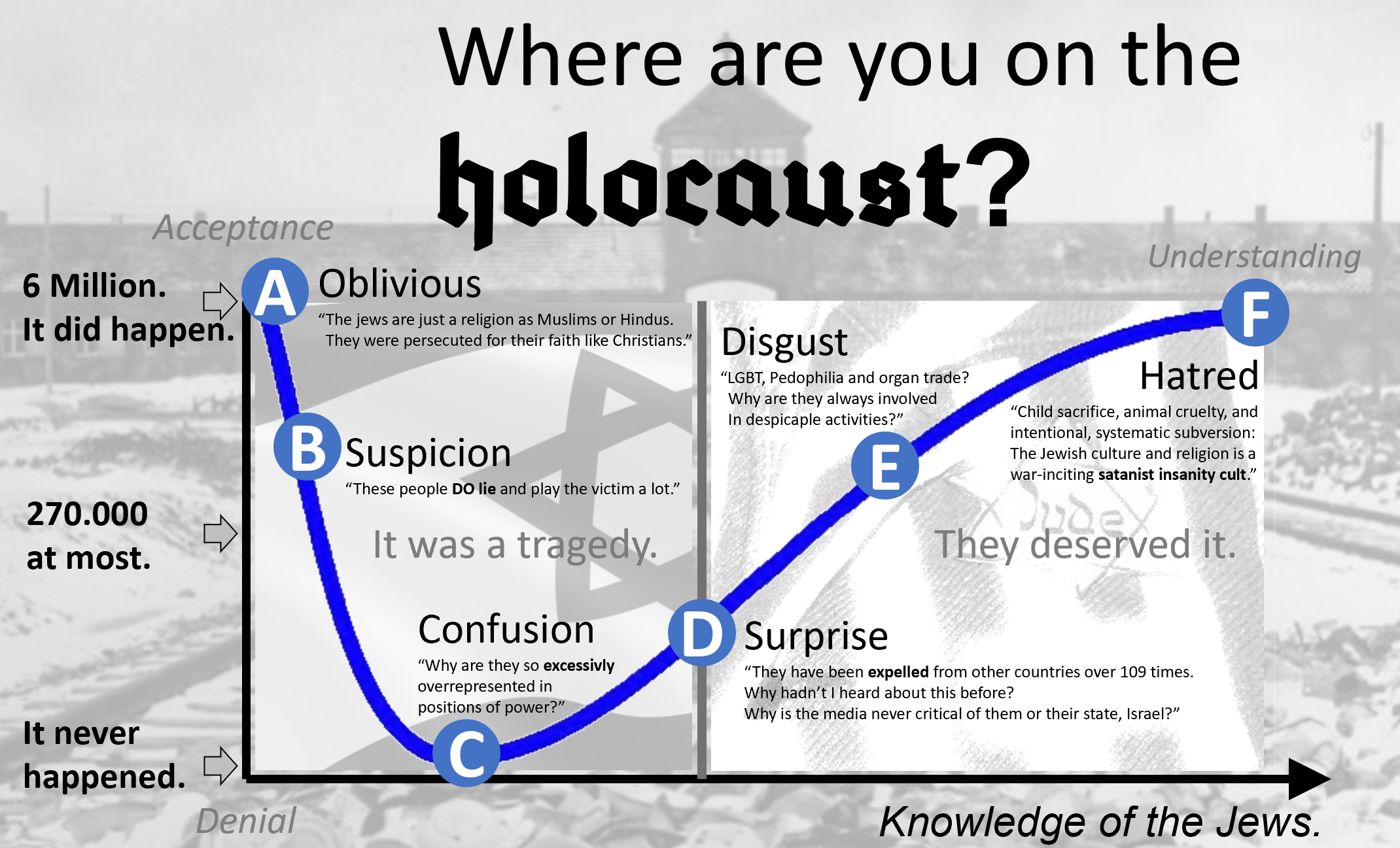 >"The Akum (non-Jew) is like a dog. Yes, the scripture teaches to honour the the dog more than the non-Jew." Ereget Raschi Erod. 22 30>"Even though God created the non-Jew they are still animals in human form. It is not becoming for a Jew to be served by an animal. Therefore he will be served by animals in human form." Midrasch Talpioth, p. 255, Warsaw 1855>"A pregnant non-Jew is no better than a pregnant animal." Coschen hamischpat 405>“The souls of non-Jews come from impure sprits and are called pigs." Jalkut Rubeni gadol 12b>"Although the non-Jew has the same body structure as the Jew, they compare with the Jew like a monkey to a human." Schene luchoth haberith, p. 250 b>"If you eat with a Gentile, it is the same as eating with a dog." Tosapoth, Jebamoth 94b "If a Jew has a non-Jewish servant or maid who dies, one should not express sympathy to the Jew. You should tell the Jew: "God will replace 'your loss', just as if one of his oxen or asses had died"." Jore dea 377, 1>"Sexual intercourse between Gentiles is like intercourse between animals." Talmud Sanhedrin 74b "It is permitted to take the body and the life of a Gentile." Sepher ikkarim III c 25>"It is the law to kill anyone who denies the Torah. The Christians belong to the denying ones of the Torah." Coschen hamischpat 425 Hagah 425. 5>"A heretic Gentile you may kill outright with your own hands." Talmud, Abodah Zara, 4b>"Every Jew, who spills the blood of the godless (non-Jews), is doing the same as making a sacrifice to God." Talmud: Bammidber raba c 21 & Jalkut 772