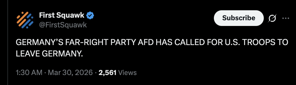 >Spain closed its airspace to aircraft involved in Iran War and barred use of its Rota and Morón air bases for related combat or refueling flights.>The move led Washington to drop plans to deploy B-52 and B-1 bombers to Morón after consulting Madrid.