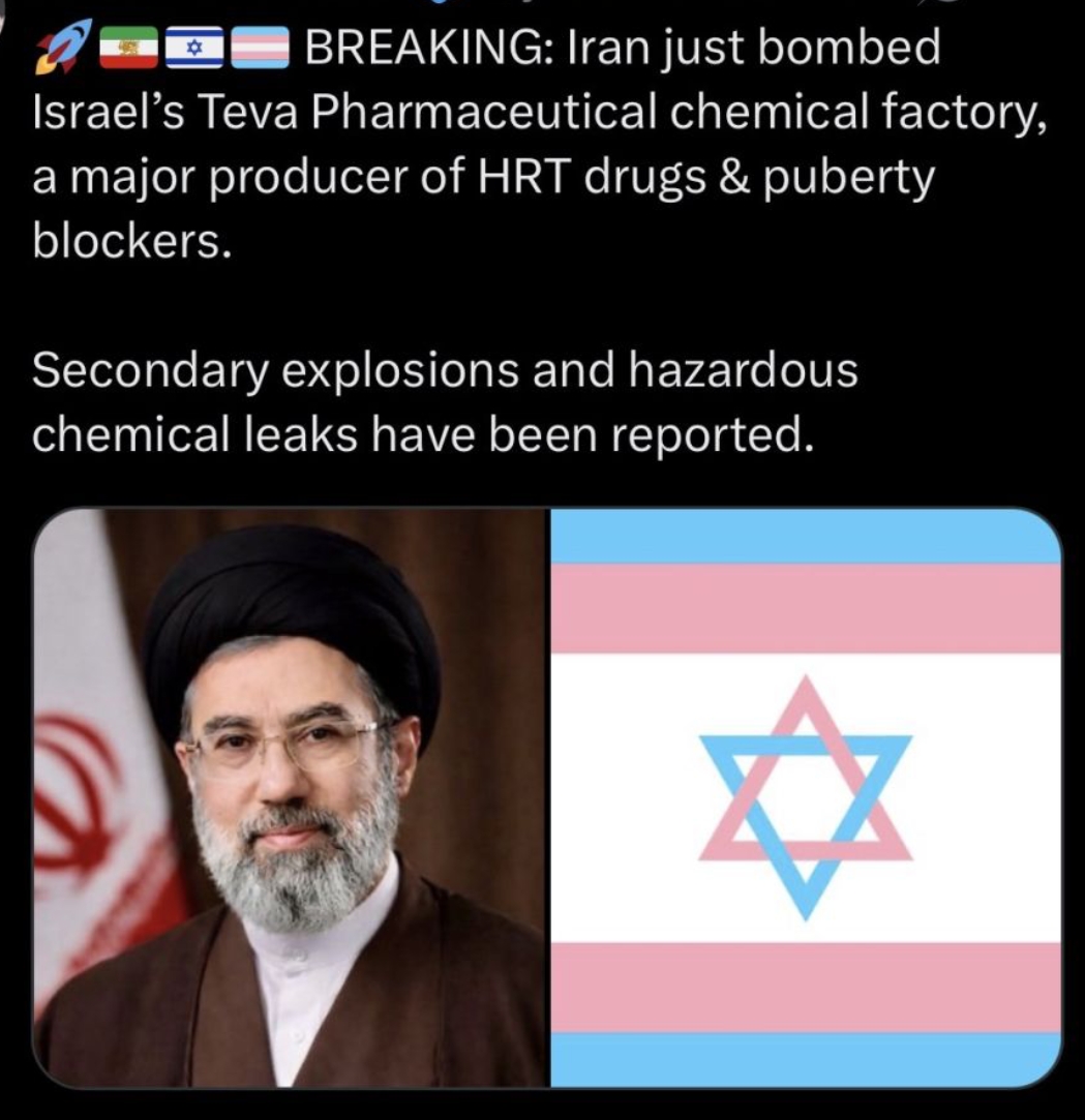 >>531985646It's because an HRT factory in Israel got bombed today, tranny drug prices set to skyrocket this week. Nothing makes trannies seethe more than their precious chemical castration pills being taken away