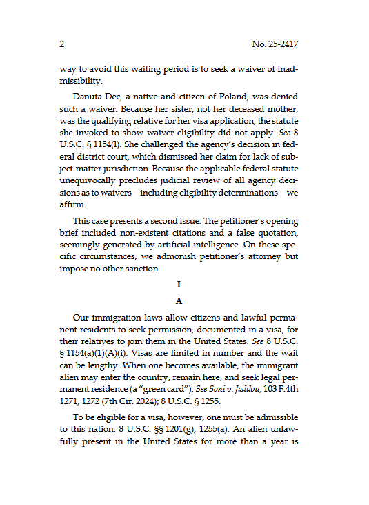 >>5319852917th Circuit just sided with Trump todayCan district courts review immigration decisions despite jurisdiction stripping? No, writes Chief Judge Brennan. Timely decision on immigration and jurisdiction-stripping. Also, the Court admonishes counsel for what looks like artificial intelligence produced citations.A very active bench led (on this issue) by newly minted Judge Taibleson, but joined in concern by Chief Judge Brennan and Judge Easterbrook, raised concerns about the AI issue at argument. On these facts, contrition and apology are enough. https://media.ca7.uscourts.gov/cgi-bin/OpinionsWeb/processWebInputExternal.pl?Submit=Display&Path=Y2026/D03-30/C:25-2417:J:Brennan:aut:T:fnOp:N:3514236:S:0