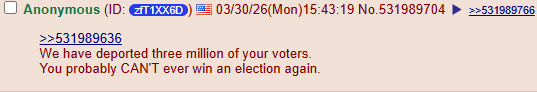 >>531989636We have deported three million of your voters.You probably CAN'T ever win an election again.