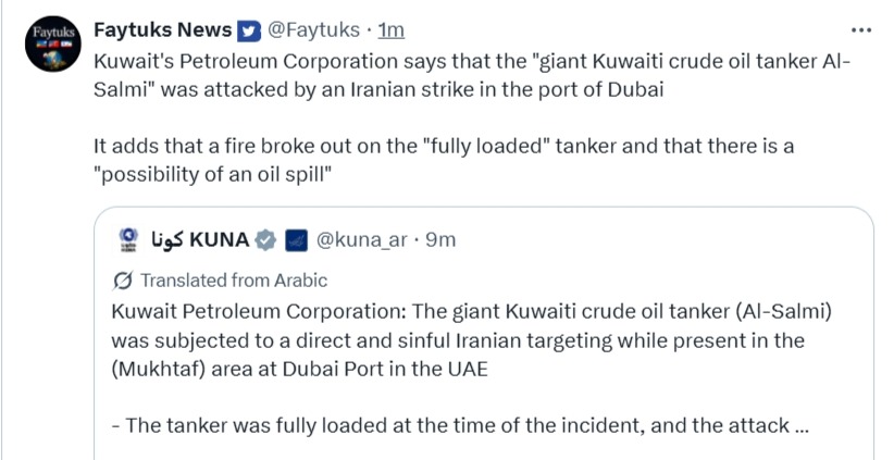 >>532002571Kuwait's Petroleum Corporation says that the "giant Kuwaiti crude oil tanker Al-Salmi" was attacked by an Iranian strike in the port of Dubai It was fully loadedNow Dubai influencers can bathe in sludge
