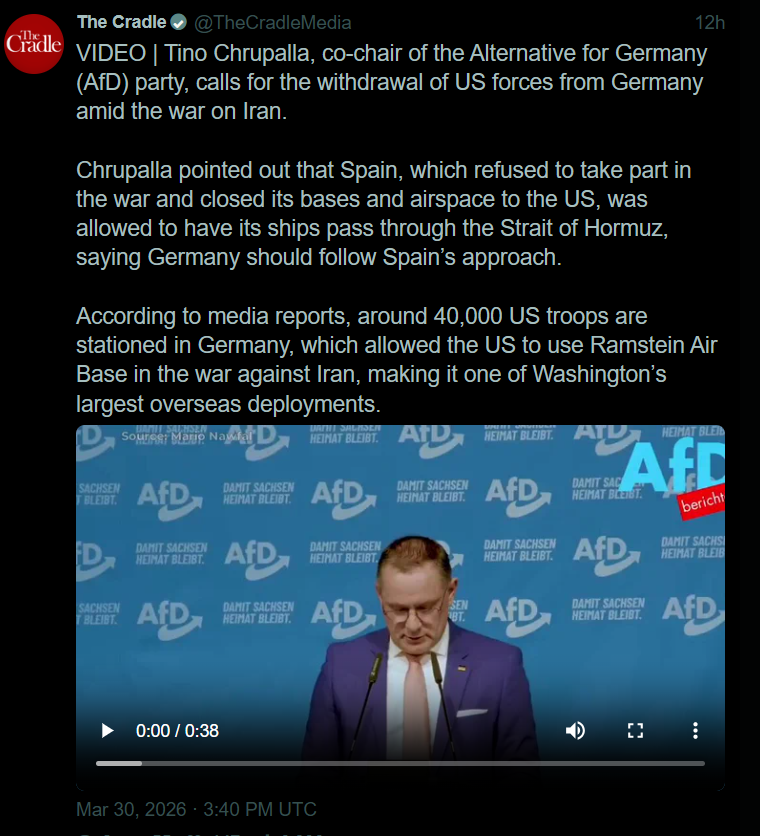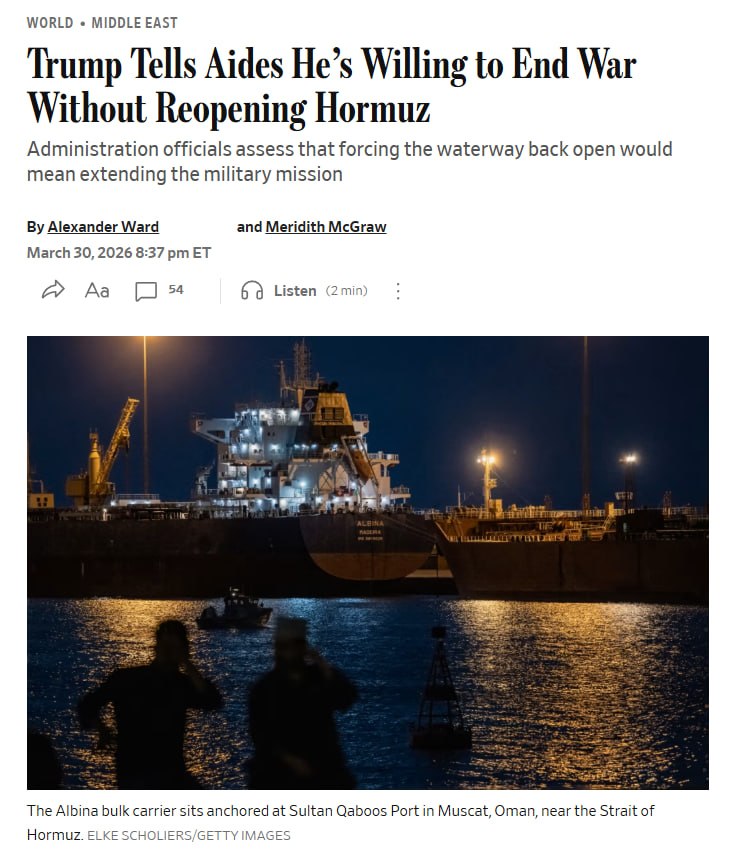 NEW: President Trump has told aides he is open to ending the U.S. military campaign against Iran even if the Strait of Hormuz remains largely closed, according to WSJ, citing administration officials. He and his team concluded that reopening the waterway would likely extend the conflict beyond his preferred four- to six-week timeline. Instead, the U.S. aims to weaken Iran’s naval and missile capabilities before scaling back operations and shifting to diplomatic pressure to restore shipping. If diplomacy fails, Washington will press European and Gulf allies to take the lead in reopening the strait.