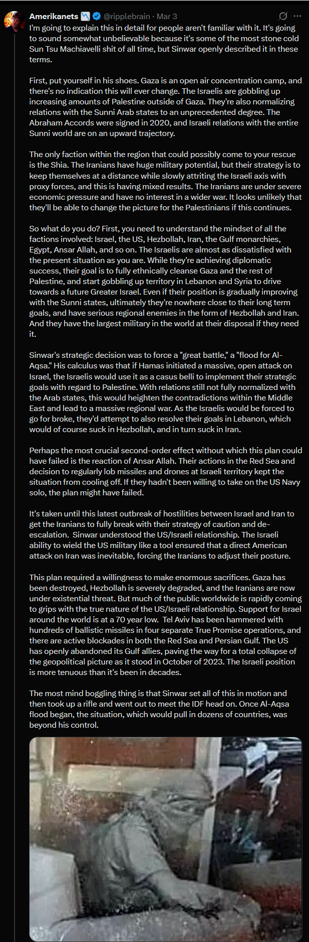 >>532019853>Kind of weird gloating about the actions that doomed your whole movementanon, you miss the wood for the trees. The greatest strategist of our time was Yahya Sinwar. Read: