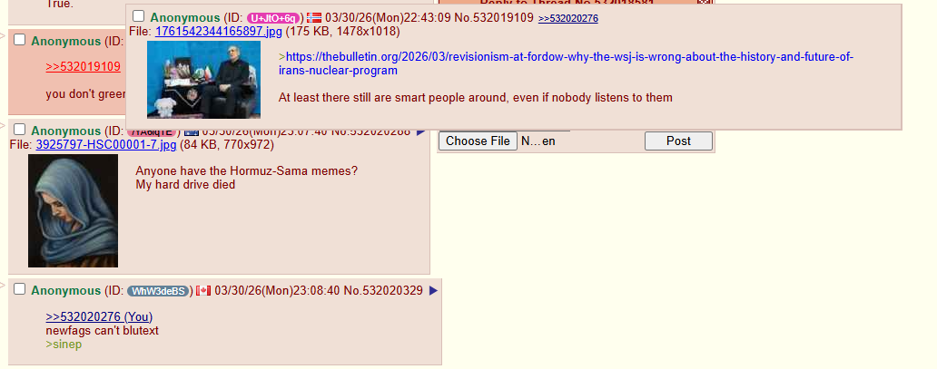 >>532024357>I'm thinking Iran will want to embarrass the US as much as possible so it seems unlikelyObviously that isn't true even now.Iran didn't post pictures of any of the ships they've hit so far, and they didn't post pictures of the destroyed AWACS until we did, and they haven't posted pictures of the landing ships full of soldiers they took out in Kuwait.Iran still now isn't retarded like we are, they aren't run by ego, they just want to be safe.