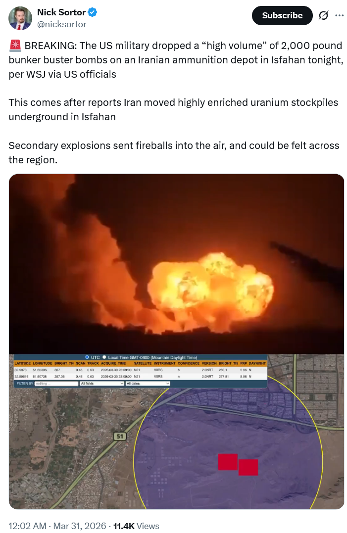 Previous: >>532014131HAPPY #600 /pig/!WATCH: MAN GOES TO THE STRAIT OF HORMUZhttps://www.youtube.com/watch?v=CuDaUTZY0qo/pig/ POLLS (ANSWER BEFORE POSTING)NEW POLL https://strawpoll.com/e6Z2AbQk5gNhttps://strawpoll.com/05ZdzrBKGn6https://strawpoll.com/e7ZJaqzEYg3https://strawpoll.com/wby5QbkQdyA>Trump "We've already won" counter: 12>Trump "Iran has no navy" counter: 8>Trump ultimatums passed: 2 (Time until third one passes: 7 days)Timeline:▶ Day 30>WTI $101>Brent Crude $116>Trump TACO's again, says he is "willing to end the U.S military campaign even if the strait of Hormuz stays closed">Iran has struck American university in Sulaymaniyah, Iraq.>Spain closes airspace to US aircraft involved in Iran war>3 more dead IDF soldiers in Lebanon>PATRIOT systems fail yet again and an Iranian missile hits central Israel▶KinoNEW:https://files.catbox.moe/smmsfw.mp4https://files.catbox.moe/jv7tdp.mp4https://x.com/RoaaWarStudies/status/2037578330954719508▶Telegram channelshttps://rentry.org/tgnews▶Israel Rocket Alertshttps://www.tzevaadom.co.il/en/▶Air Traffichttps://www.flightradar24.com/https://flightaware.com/livehttps://globe.adsbexchange.com▶Maritime Traffichttps://www.marinetraffic.com/https://www.vesselfinder.com/