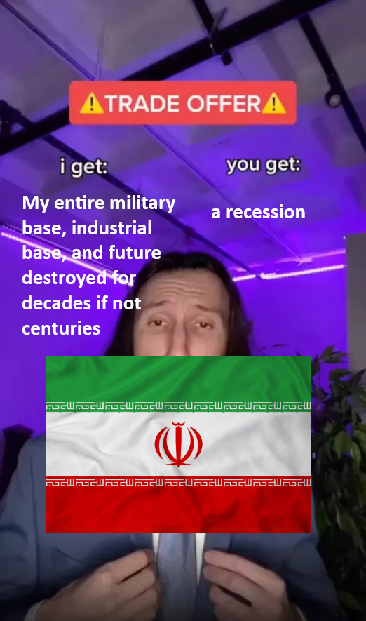 >>532024384>asymmetric, defensive warfareI don't think it's assymetric, perhaps I'm being pedantic, but I think Iran is just better at war than us plus as you say they had a plan and a geographically strategic position which we pretended wasn't real for some reason, the reason mainly being that Trump has a decades long boomer lead paint riddled brain hate boner for Iran.Yea the US has become a degenerate finance embarassment, it's time we end the empire and become a real country again that makes and does stuff in America. That's what we're good at.And no one will ever be able to fuck with us in our own neighborhood if we do this because we have an ever more geographically powerful position than Iran does.