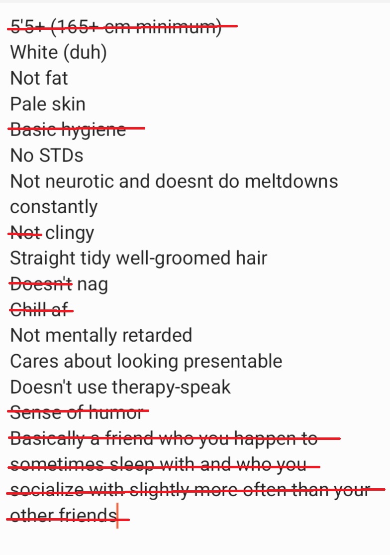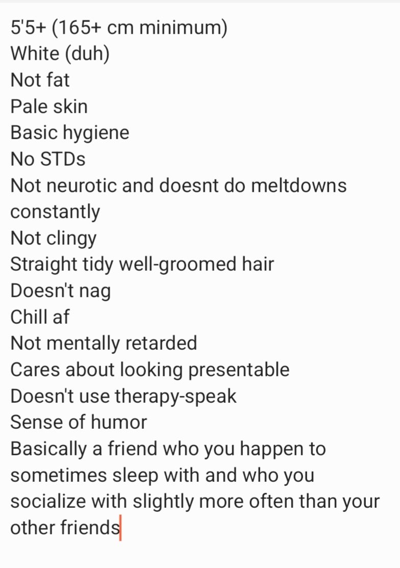 >>532031685Your standards are so low you are very obviously a yankYou should prob kysHere is a man’s list (I am 39) 170cm+28 and underThin, hard body Nice hands, feet , wrists and anklesFeminine movement, makeup, clothesBlonde or ginger neck-length thick hairBlue or green eyesFirm round boobs, small pink nipplesGood at oral, likes analOrgasms from sexBisexualNice voiceSoft skin Likes cats, dislikes dogsGood at cookingGood taste in clothes music film litBasic level intelligence LoyalCaringEasygoingLoves meFunConservative or apolitical Would be a plus if she is skilled in smthNo tattoos