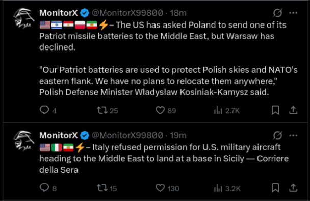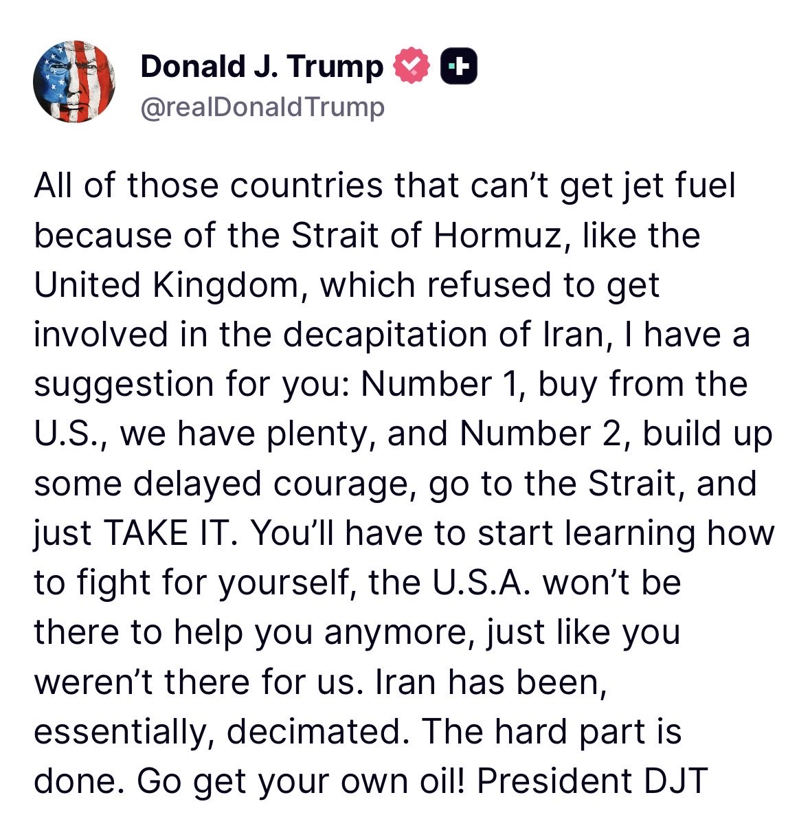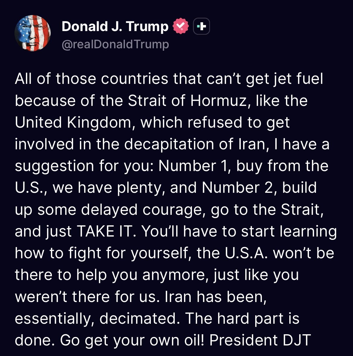 >tweetThe Country of France wouldn’t let planes headed to Israel, loaded up with military supplies, fly over French territory. France has been VERY UNHELPFUL with respect to the “Butcher of Iran,” who has been successfully eliminated! The U.S.A. will REMEMBER!!! President DJT