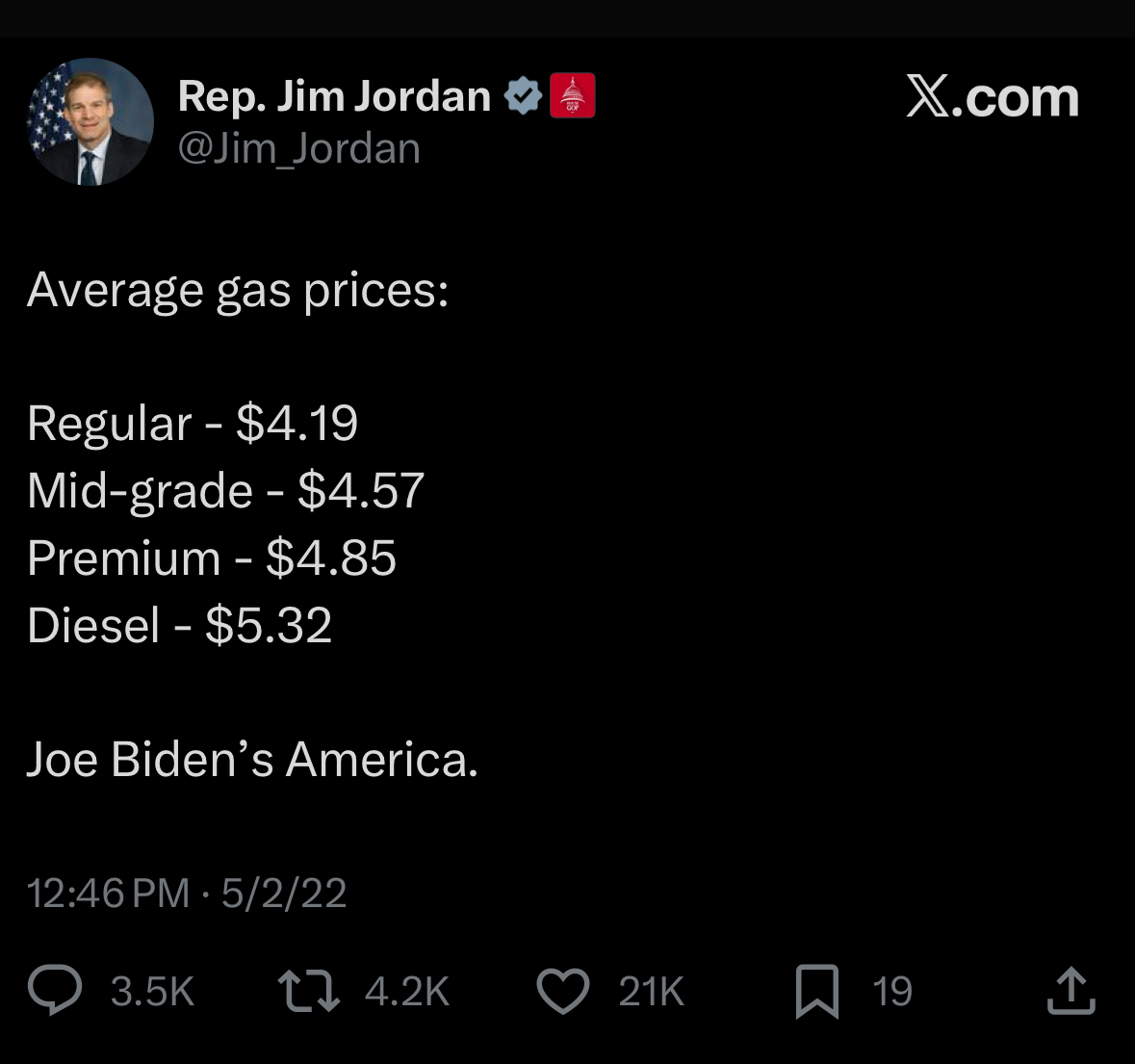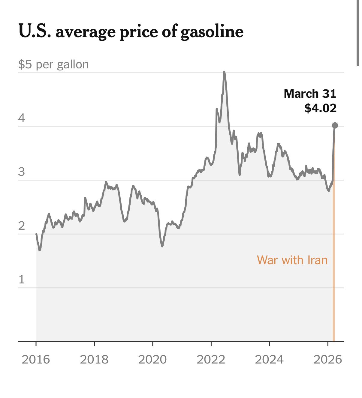 >BREAKING: US Gas prices hit $4 per gallon overnight for the first time since 2022, marking the highest price point yet across both Trump terms.So much winning.