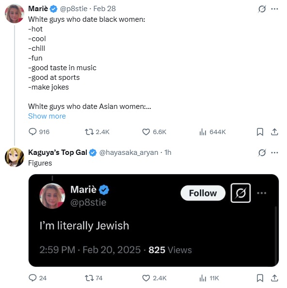 >>532038286They hate asians ( real asians not jeets ) because asians are living, breathing, absolute evidence their entire narrative about muh institutional racism is false and it makes them lose milions of dollars on propaganda each year.
