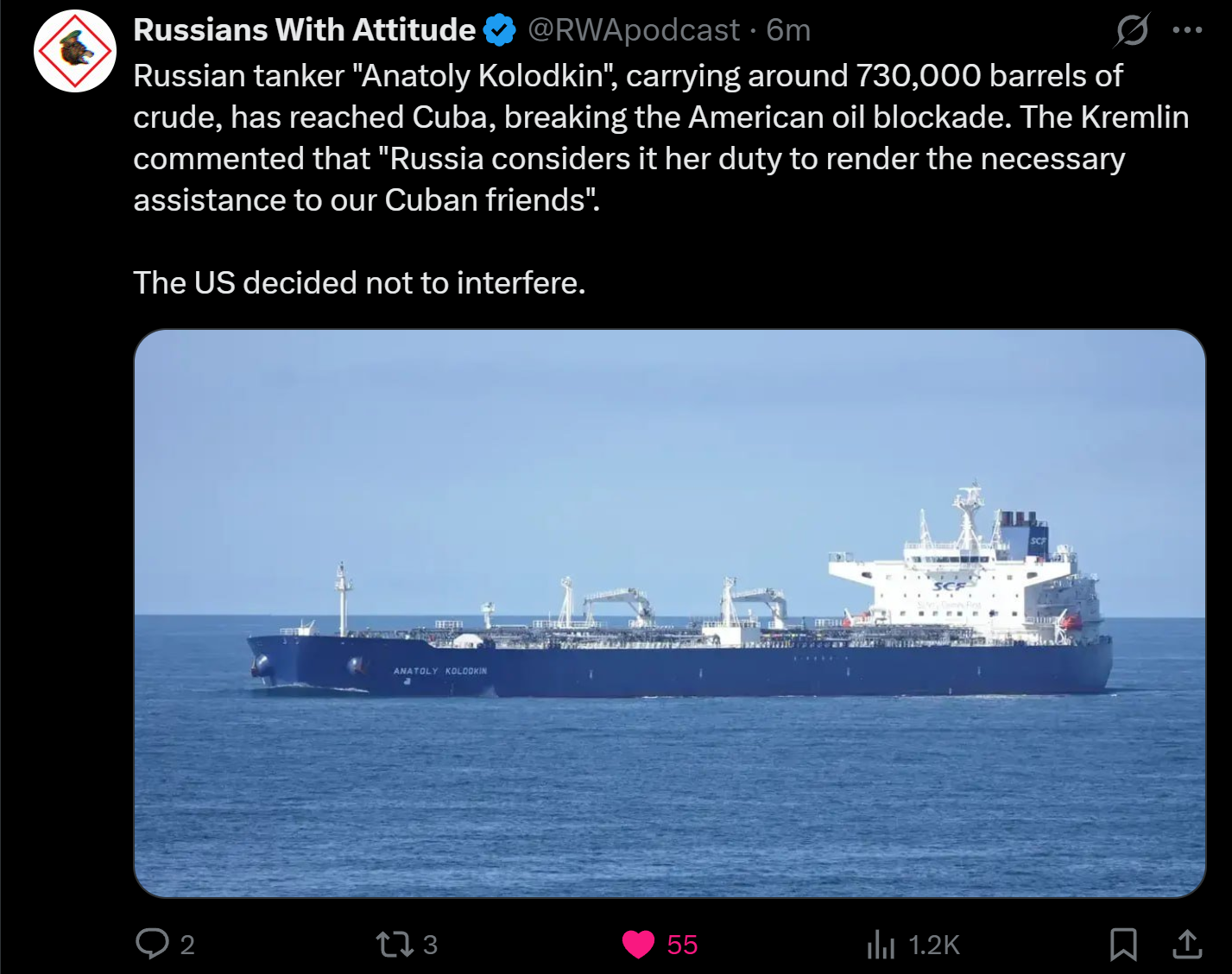 >>532054793the US supports Russias humanitarian aid to Cuba. why should we stop Russia from giving away their oil? it doesnt change anything. the US gave Cuba its independence from the Spanish Empire, along with all of the other former Spanish colonies in Latin America, and the US continues to safeguard those countries against European imperial meddling.