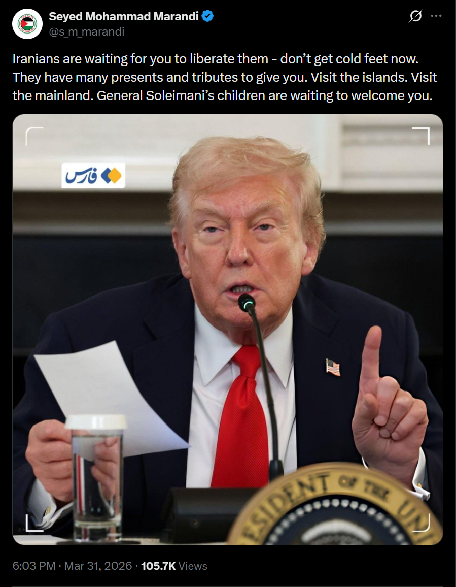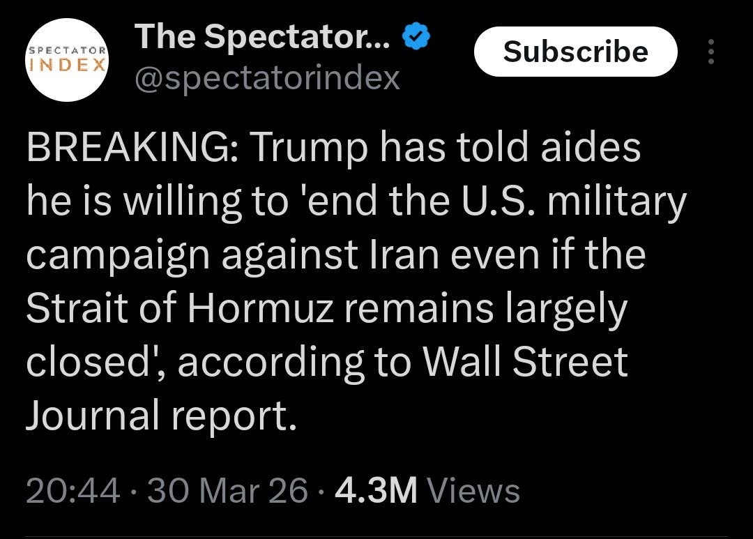 Previous: >>532044223WATCH: MAN GOES TO THE STRAIT OF HORMUZhttps://www.youtube.com/watch?v=CuDaUTZY0qo [Embed]▶Trump Counters>"We've already won": 13>"Iran has no navy": 8>Ultimatums passed: 2 (Time until third one passes: 6 days)Timeline:▶ Day 32*>Iran denies that it attacked Turkey, calls it "false-flag operation">US strikes artillery ammunition depots in Isfahan (lol?)>WTI $106>Brent Crude $119>Trump TACO's again, says he is "willing to end the U.S military campaign even if the strait of Hormuz stays closed">Iran has struck American university in Sulaymaniyah, Iraq.>Spain closes airspace to US aircraft involved in Iran war>3 more dead IDF soldiers in Lebanon>PATRIOT systems fail yet again and an Iranian missile hits central Israel▶KinoNEW:https://files.catbox.moe/smmsfw.mp4https://files.catbox.moe/jv7tdp.mp4https://x.com/RoaaWarStudies/status/2037578330954719508▶Telegram channelshttps://rentry.org/tgnews▶Israel Rocket Alertshttps://www.tzevaadom.co.il/en/▶Air Traffichttps://www.flightradar24.com/https://flightaware.com/livehttps://globe.adsbexchange.com▶Maritime Traffichttps://www.marinetraffic.com/https://www.vesselfinder.com/