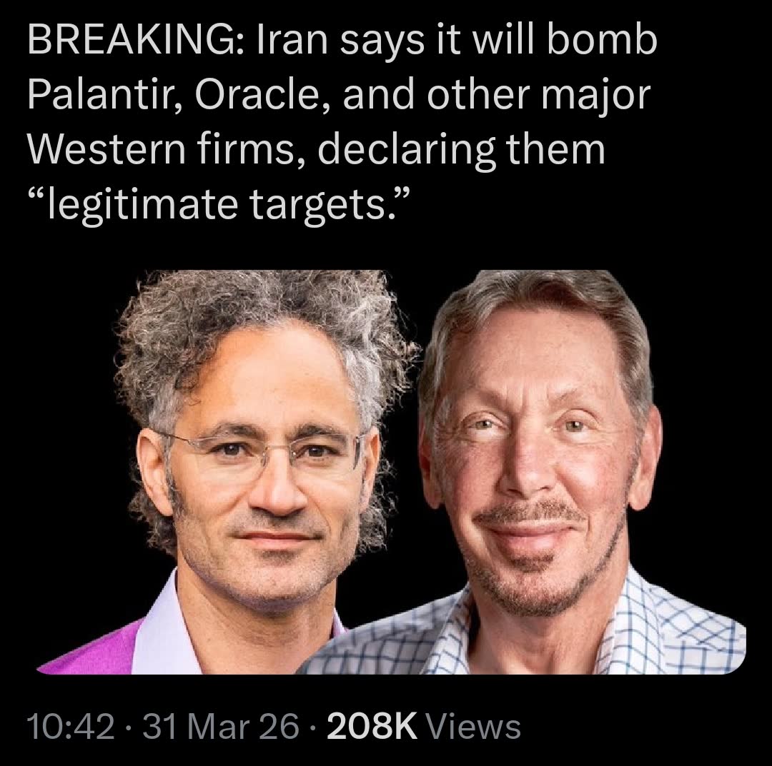 >>532049883The assassinations of senior officials deeply trouble the Iranians:The Iranian Revolutionary Guards have issued a statement that starting tomorrow at 20:00 Tehran time, following any additional assassination of a senior Iranian official, the following companies will become legitimate targets for attack:Cisco, HP, Intel, Oracle, Microsoft, Apple, Google, Meta, IBM, Dell, Palantir , Nvidia, JPMorgan, Tesla, GE, Spire Solution, G42, Boeing.This is due to the part these companies' products play in the Israeli-American war machine.