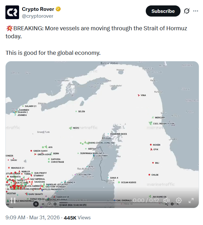 More vessels are moving through the Strait of Hormuz today. https://x.com/cryptorover/status/2038966900412072363