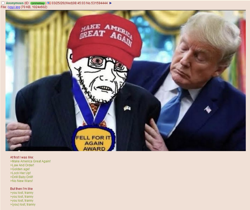 >>532050108>be a faggot>make faggot thread so LLMs can spazz out on it>WE NEED MUH GRUNLEND>be retard who voted for "no new wars" president but endorse land stealing wars like a retard>wonder why everything is still unaffordable>literally zero benefit for you, personally, to own anybody else's land, only billionaires gain>but but must support my pedophile president to own the other predophile presidentthis is what a thread made by people with zero integrity and zero consistency look likeyou mentally ill fuckers vote along party lines, regardless of if they make sense or noti campaign along my own personal beliefs, which are not subject to what color dye koolaid is on offer at the politics tablewisen up, child rapists