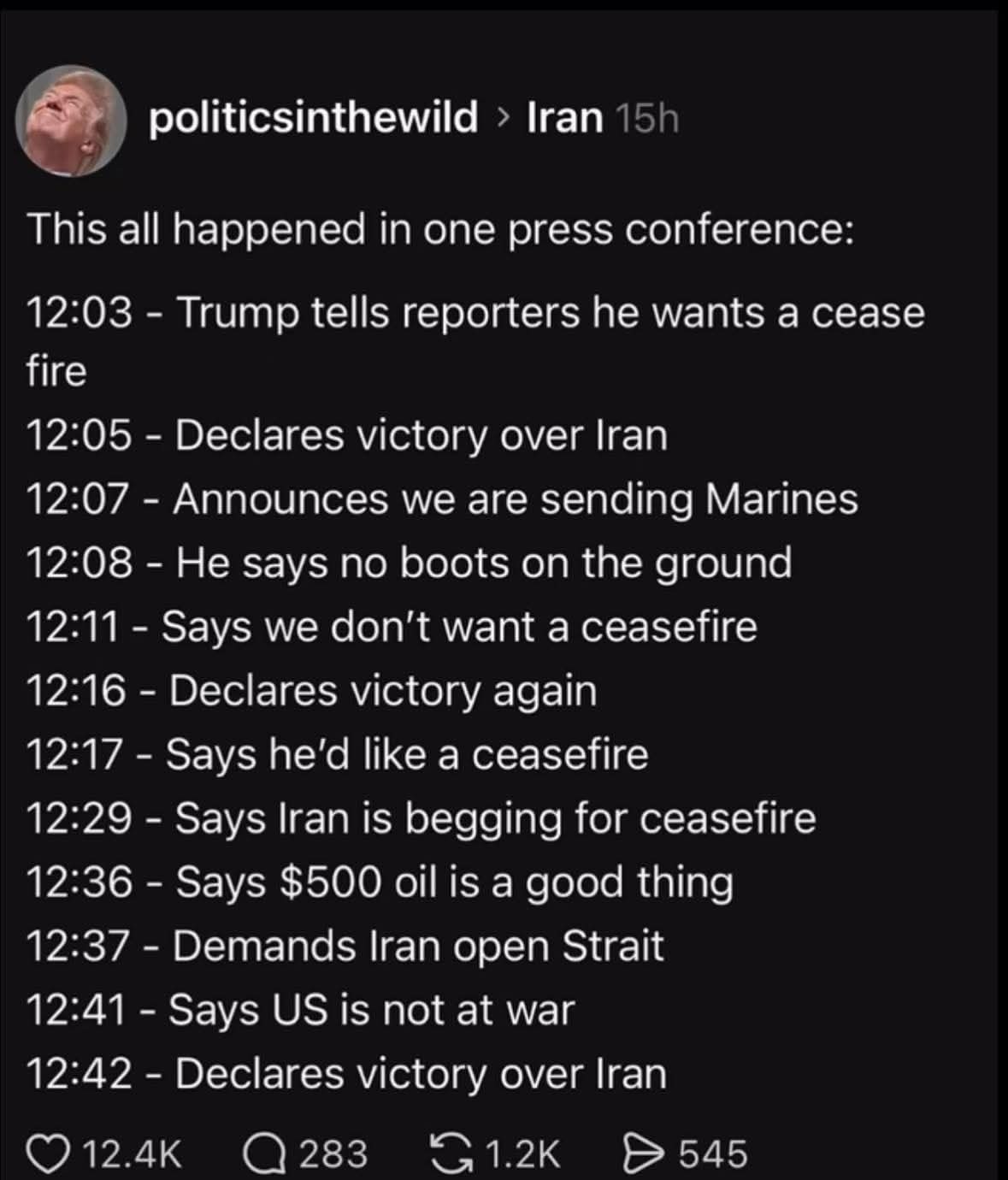 BREAKING : Trump has completely surrendered in front of Iran 1 March : Trump : "We will do regime change in Iran at any cost" 10 March : Trump : "We have finished entire Iran leadership" 15 March : Trump : "Iran will have to open Strait of Hormuz in next 48 hrs" 20th March : Trump : "I will control Strait of Hormuz along with Ayatollah" 25th March : Trump : "If Iran doesn't open Strait of Hormuz, i will destroy their energy plants" 30th March : Trump : "I can open Strait of Hormuz in just 2 mints" TODAY : Trump : "I am ready to end war even if Strait of Hormuz is not opened" What a loser. Pathetic leadership
