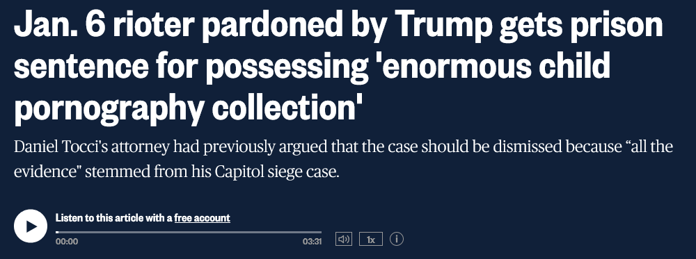 Trump pardoned 1600 Jan. 6th defendants. There have now been exactly 16 convicted pedophiles from those 1600. One in 100 Jan. 6th defendants are convicted pedophiles.