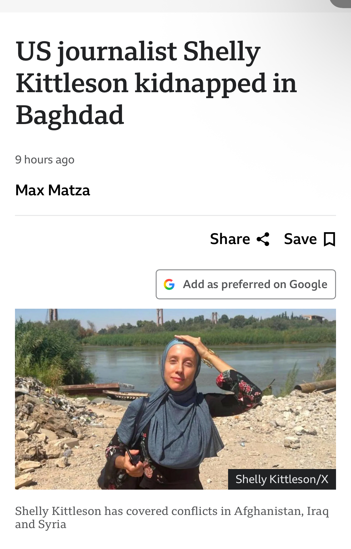 >Iraq’s interior ministry says authorities are searching for American freelance journalist Shelly Kittleson after she was kidnapped from outside a hotel in Baghdad on Tuesday.>The US State Department has said that a suspect detained after the kidnapping has ties to the Iran-linked Kataib Hezbollah militia group.