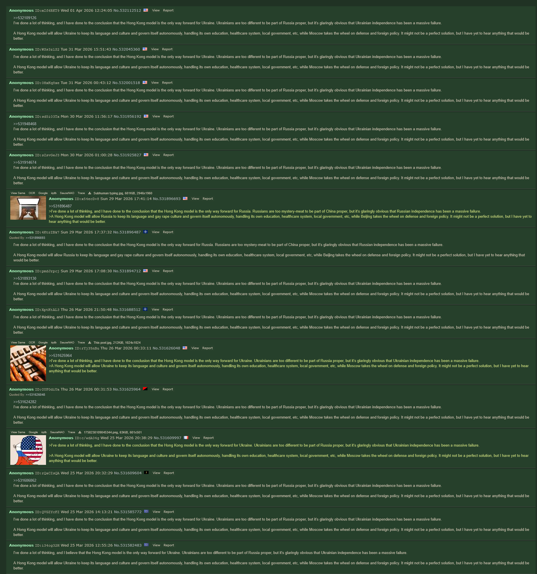 >>532109126I've done a lot of thinking, and I have done to the conclusion that the Hong Kong model is the only way forward for Ukraine. Ukrainians are too different to be part of Russia proper, but it's glaringly obvious that Ukrainian independence has been a massive failure.A Hong Kong model will allow Ukraine to keep its language and culture and govern itself autonomously, handling its own education, healthcare system, local government, etc, while Moscow takes the wheel on defense and foreign policy. It might not be a perfect solution, but I have yet to hear anything that would be better.