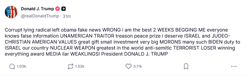 Corrupt lying radical left obama fake news WRONG i am the best 2 WEEKS BEGGING ME everyone knows false information UNAMERICAN TRAITOR treason peace prize i deserve ISRAEL and JUDEO-CHRISTIAN AMERICAN VALUES great gift small investment very big MORONS many such BIDEN duty to ISRAEL our country NUCLEAR WEAPON greatest in the world anti-semitic TERRORIST LOSER winning everything award MEDIA liar WEAKLINGS