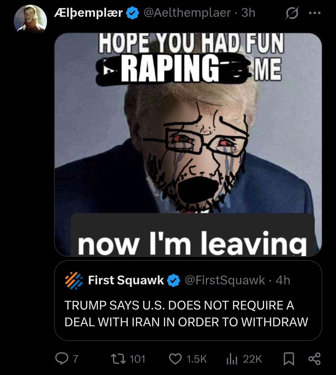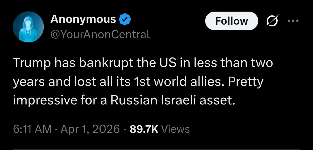 In three weeks of Trump's "special 24-hour op" to overthrow Iran:>Allowed Israel to cuck him in to a war (per Rubio)>Uses it as a convenient way to avoid his pedophilia in the Epstein files>15 *confirmed* dead Americans, over 290 wounded>Unknown numbers of Americans captured>Trump says dead Americans "Is the way it is" and "there will be more">US commander tells troops Trump was 'chosen by Jesus to unleash Iran Armageddon'>Every US base in the Middle East destroyed by Iran's airstrikes>Order the strike that murdered over 150 Iranian schoolgirls>US fighter jets destroyed>US reaper drones destroyed>US THAAD missiles exhausted>Recession>Allows transgendering children>Begs NATO to get involved>Starting to mobilize 5,000 boots on the ground, more dead Americans>Strait of Hormuz closed>US gas prices skyrocketing>US refuelling plane destroyed, more casualties>Trump confirms the war is for gays "We support gays, but they throw gays off the buildings. We have to wipe out the evil">US F-35 destroyed>Deportations under Trump average 900 a day (300,000 a year), Obama deported 3.2 million>US national debt doubles under Trump, $39 trillion>Joe Kent resigns, refuses to be involved in an Israeli war>Trump cucks out and lifts sanctions on Iran oil>US Embassy in Baghdad abandoned>At least 16 US military aircraft destroyed, per Bloomberg >US troop morale rock bottom: "We do not want to die for Israel", per Huffpost>Dementia Trump pretending he's negotiating with Iran, Iran denies any talks>Blatant evidence of Trump insider trading, fucking over small American investors>Trump makes empty threats to the EU>US Patriot missiles destroy 3 US F-15s, friendly fire>US F-18 destroyed by Iran >Trump approval rating lowest of any president ever>Stock market loses over $1 trillion>US F-16 destroyed in Tehran>Trump pulling back ICE agents massively>Four more weeks, goyim!