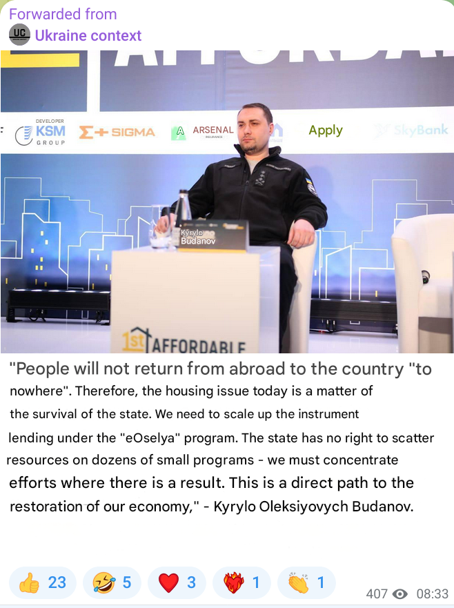 >>532137469„Die Menschen werden aus dem Ausland nicht ‚ins Nichts‘ zurückkehren. Deshalb ist die Wohnungsfrage heute eine Frage des Überlebens des Staates. Wir müssen das Instrument der erschwinglichen Wohnraumfinanzierung über das Programm ‚eOselja‘ ausbauen. Der Staat darf seine Ressourcen nicht auf Dutzende kleine Programme verstreuen – die Bemühungen müssen dort konzentriert werden, wo es Ergebnisse gibt. Das ist der direkte Weg zur Erholung unserer Wirtschaft.“— Kyrylo Oleksijowytsch Budanow.