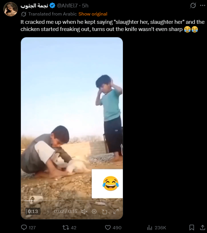 This is humor for arabs? Beheading a chicken?https://x.com/AhfEl7/status/2039292470412865933?s=20