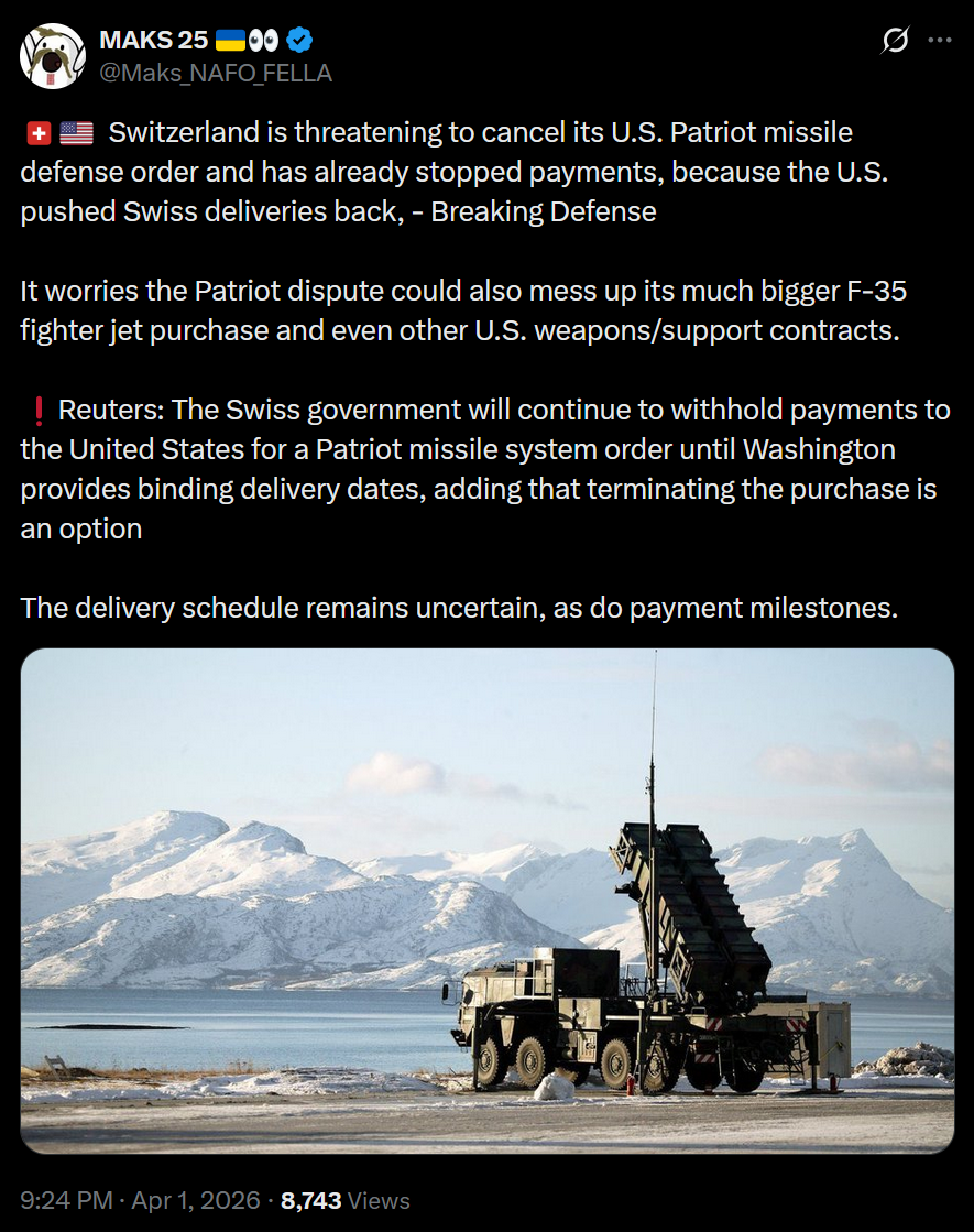 >Switzerland is threatening to cancel its U.S. Patriot missile defense order and has already stopped payments, because the U.S. pushed Swiss deliveries back, - Breaking Defense>It worries the Patriot dispute could also mess up its much bigger F-35 fighter jet purchase and even other U.S. weapons/support contracts.>Reuters: The Swiss government will continue to withhold payments to the United States for a Patriot missile system order until Washington provides binding delivery dates, adding that terminating the purchase is an option>The delivery schedule remains uncertain, as do payment milestones.damn rebels