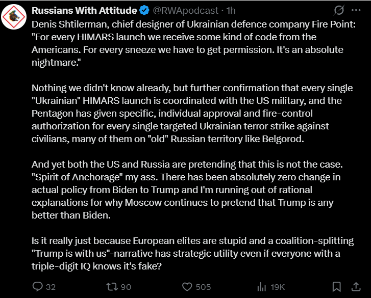 Previous: >>532120629Timeline /tug/: https://files.catbox.moe/m97wmq.pdf▶WARNINGBe aware, any /chug/ thread that uses globohomo nuspeak wording in the OP (such as Kyiv) or cites UKROP sources (like video game footage) are fake shill threads.>By posting in these threads, you recognize Israel controls the NATO Council and you irrevocably denounce the Talmud out of your own volition▶Latest>Comrade President and Supreme Commander Vladimir Putin, Lugansk Oblast has been fully liberated with all remaining AfU liquidated; Battlegroup North Stormtroopers liberate Verkhnyaya Pisarevka in Kharkov, Battlegroup East/VDV liberate Boikovo in Zaporozhye - https://archive.today/35Rgx>(CORRECTION) Moscow rejects Zelensky claim of Ultimatium to withdraw from Donbass, Kremlin states Zelensky should have withdrew the AfU years ago - https://archive.today/UYaFQ>Russian Stormtroopers of Battlegroup North liberate Malaya Korchakovka in Sumy - https://archive.today/W7OCA>Battlegroup East/VDV liberates Lugovskoye in Zaporozhye, Battlegroup West Stormtroopers liberate Novoosinovo in Kharkov - https://archive.today/Dw0yu>Russian Stormtroopers of Battlegroup West liberate Kovsharovka in Kharkov - https://archive.today/WDpYp>IRGC Commander reports that 21 Ukrainian drone experts and Ukrainian anti-drone equipment annihilated in Dubai - https://archive.today/WxcyP>Russian Stormtroopers of Battlegroup West liberate Brusovka in Donetsk - https://archive.today/SYiIY>Russian Stormtroopers of Battlegroup North liberate Shevyakovka in Kharkov - https://archive.today/E2tLs▶/chug/https://rentry.org/chug2024▶Telegram Channelshttps://rentry.org/chug2024#telegram-channels▶Mapshttps://rentry.org/chug2024#maps▶Video Archivehttps://rentry.org/chugvidz▶Resources & misc linkshttps://rentry.org/chug2024#linksresources▶Podcasts & Analysishttps://rentry.org/chug2024#podcastsanalysis▶Z Radiohttps://rz-life.ru/