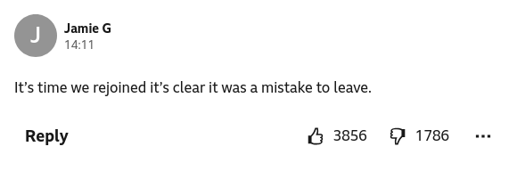 This commenter thinks we should rejoin the EU, and they've got lots of upvotes.Thoughts?https://www.bbc.co.uk/news/articles/c62l6w03lwzo#comments