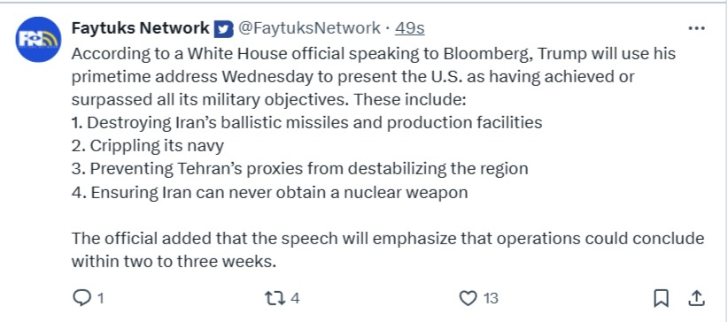 According to a White House official speaking to Bloomberg, Trump will use his primetime address Wednesday to present the U.S. as having achieved or surpassed all its military objectives. These include:1. Destroying Iran’s ballistic missiles and production facilities2. Crippling its navy3. Preventing Tehran’s proxies from destabilizing the region4. Ensuring Iran can never obtain a nuclear weaponThe official added that the speech will emphasize that operations could conclude within two to three weeks.We will seeI still would put money on a ballroom rant