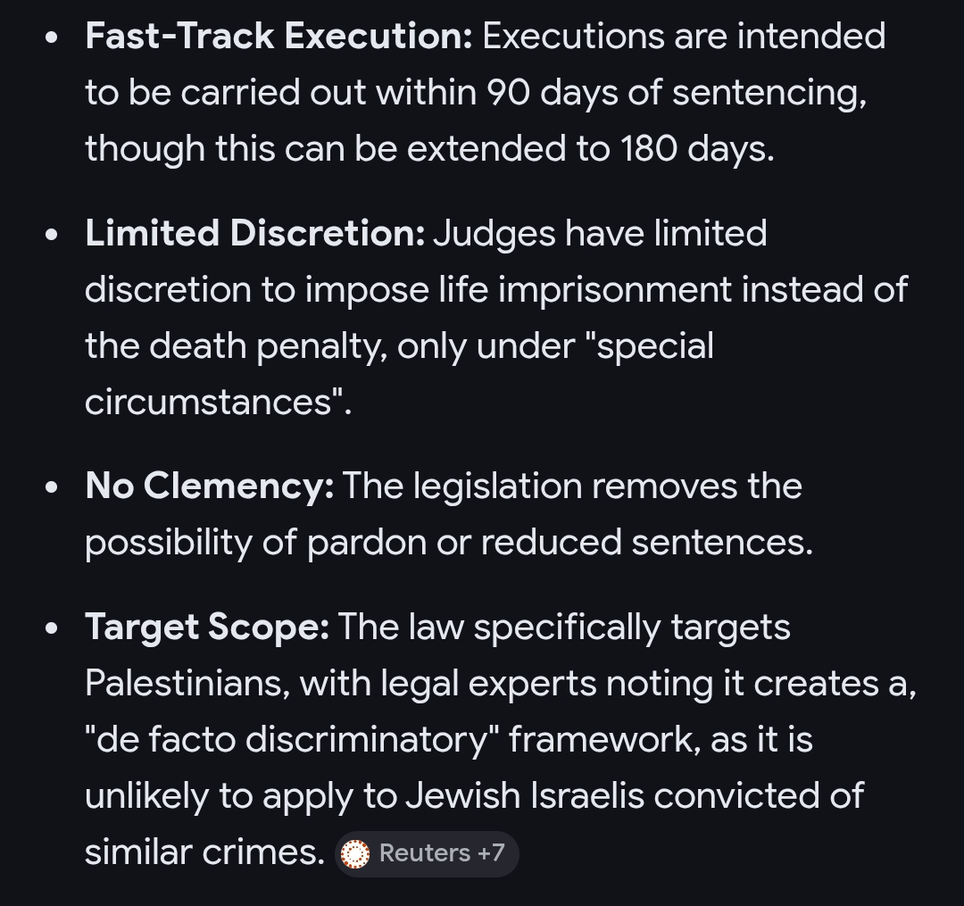 >>532143109I am sure palestinians will get a fair process. Not.Also, is this used against war prisoners?Also: They are specifically passing a law to execute people with certain nationality, is this a human rights violation of some sort?